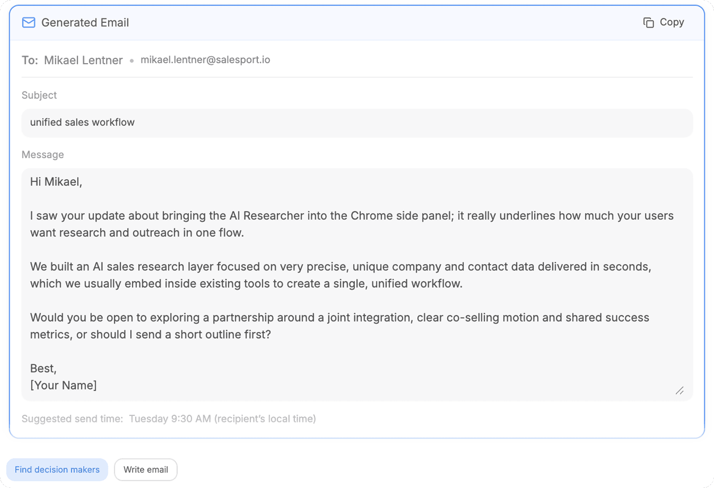 You can now write targeted cold emails directly inside the AI Sales Researcher. The new Email Writer turns your research insights into clear, relevant messages that match your product and your tone.